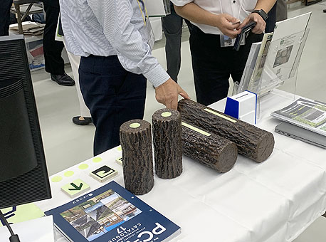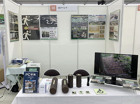 ナベシマでは防災製品として蓄光部材を埋め込んだ避難路ステップ階段のカットモデルや蓄光埋込丸太のサンプル展示、施工事例のスライド、パネル展示を行いました。